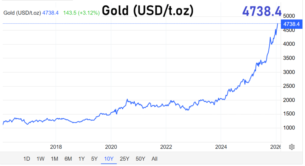 Zuletzt erreichte der Goldpreis ein weiteres Allzeithoch von rund 4739 US-Dollar je Unze. Damit setzt sich eine Entwicklung fort, die bereits seit Wochen von stetigen Kursgewinnen geprägt ist. Parallel dazu verzeichnet auch Silber deutliche Aufschläge und notiert auf dem höchsten Niveau seit Jahren. Marktbeobachter sprechen von einer Fluchtbewegung in klassische Sachwerte.