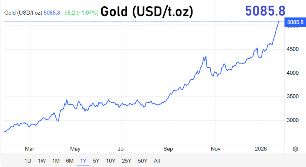 Der Goldmarkt hat ein historisches Kapitel aufgeschlagen. Erstmals in seiner Geschichte wurde eine Feinunze Gold oberhalb von 5.000 US-Dollar gehandelt. In der Spitze kletterte der Preis auf 5.093 US-Dollar und markierte damit ein neues Rekordniveau. Marktbeobachter sehen darin den vorläufigen Höhepunkt einer Entwicklung, die sich seit Monaten beschleunigt und von außergewöhnlichen politischen, wirtschaftlichen und gesellschaftlichen Spannungen begleitet wird.
