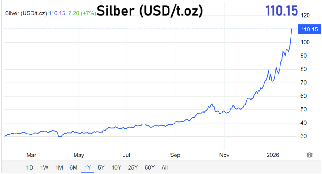 Viele Anleger weichen angesichts der hohen Goldpreise auf das deutlich günstigere Edelmetall aus. Darüber hinaus spielt Silber eine zentrale Rolle als Industriemetall, etwa in der KI-Technologie, der Robotik und der Energiewirtschaft. Diese doppelte Funktion als Wertaufbewahrungsmittel und industrieller Rohstoff verleiht Silber zusätzlichen Rückenwind.