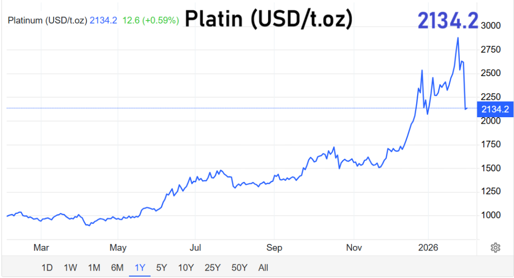 Nicht nur Gold und Silber waren von der Korrektur betroffen. Auch Platin und Palladium, die häufig als preisgünstigere Alternativen zu Gold angesehen werden, verloren deutlich an Wert. Die Abgaben zeigten, dass es sich um eine breit angelegte Bewegung handelte und nicht um eine isolierte Schwäche einzelner Metalle.