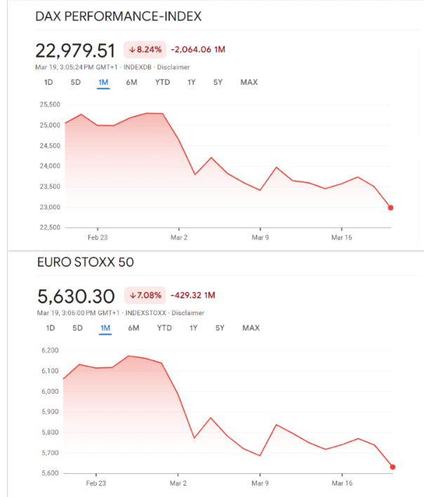 Hinzu kommt, dass die europäische Wirtschaft ohnehin keine robuste Verfassung zeigt. Eine Mischung aus geopolitischem Risiko, schwacher Industrie und unsicherer Geldpolitik ist für Aktienmärkte ein ungünstiges Umfeld. Genau deshalb fiel die Reaktion so deutlich aus.