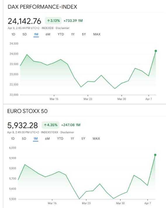 Gerade der starke Anstieg des Dax auf 24.050 Punkte verdeutlicht, wie groß das Bedürfnis nach Entlastung war. Solche Kurssprünge entstehen meist dann, wenn ein sehr negatives Szenario zuvor bereits stark eingepreist worden ist und sich die Lage dann überraschend etwas entspannt. Genau dieses Muster war nun zu beobachten.