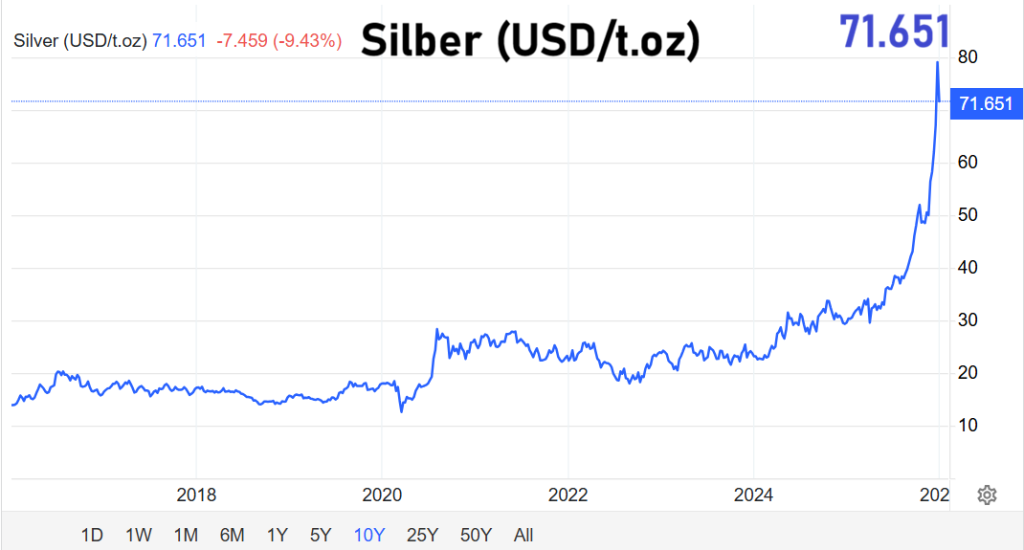 Nach einer außergewöhnlich starken Rally haben Gold und Silber zu Beginn der Woche eine scharfe Gegenbewegung vollzogen. Besonders ausgeprägt fiel die Korrektur beim Silber aus. In der Nacht erreichte der Preis für eine Feinunze zunächst ein historisches Hoch von 84,01 US-Dollar, bevor im weiteren Verlauf massive Gewinnmitnahmen einsetzten. Am Ende des Handelstags notierte Silber nur noch bei 71,89 US-Dollar, ein Rückgang von mehr als 14 Prozent innerhalb weniger Stunden. Auch der Goldpreis konnte sich dem Abgabedruck nicht entziehen und gab nach einem Hoch bei 4.549 US-Dollar deutlich nach.